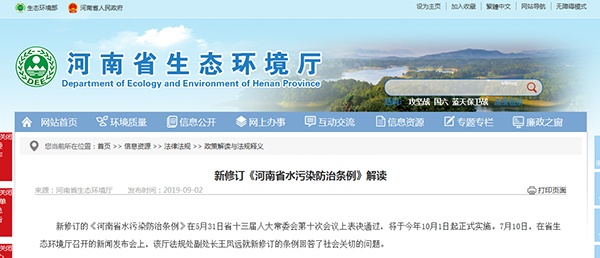 2019年09月02日,河南省生態環境廳發布新修訂《河南省水污染防治條例》解讀,詳情如下: