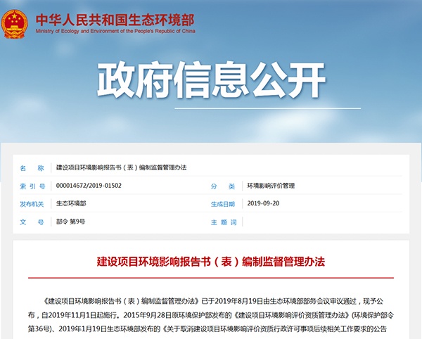 2019年9月20日,生態(tài)環(huán)境部發(fā)布了《建設(shè)項目環(huán)境影響報告書(表)編制監(jiān)督管理辦法》,詳情如下: