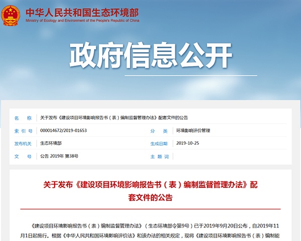 2019年10月25日,生態環境部發布了《建設項目環境影響報告書(表)編制監督管理辦法》配套文件,詳情如下: