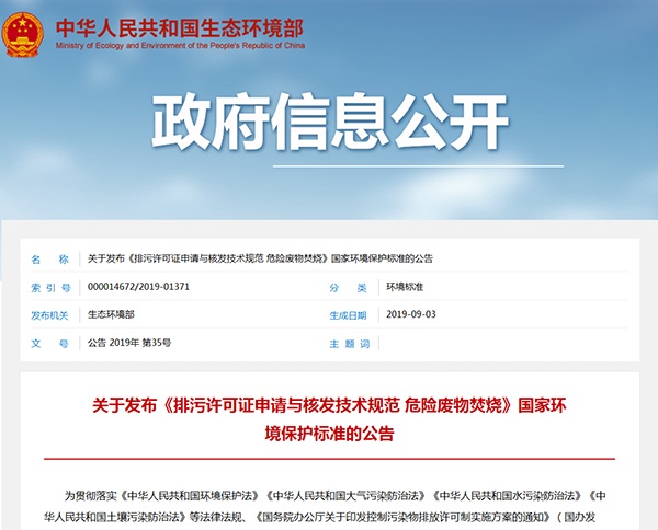 2019年9月3日,生態環境部發布《排污許可證申請與核發技術規范 危險廢物焚燒》,詳情如下: