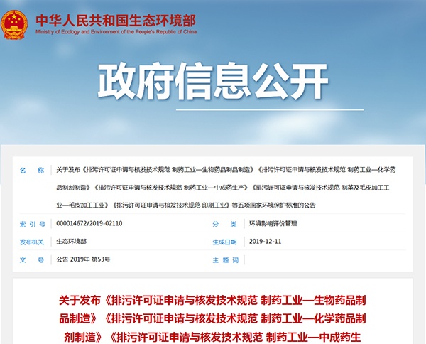 2019年12月11日,生態環境部發布《排污許可證申請與核發技術規范 制藥工業—生物藥品制品制造》《排污許可證申請與核發技術規范 制藥工業—化學藥品制劑制造》《排污許可證申請與核發技術規范 制藥工業—中成藥生產》《排污許可證申請與核發技術規范 制革及毛皮加工工業—毛皮加工工業》《排污許可證申請與核發技術規范 印刷工業》,詳情如下: