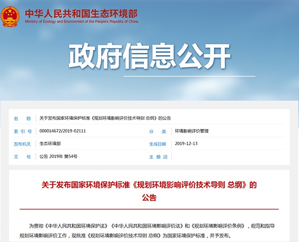 2019年12月13日,生態環境部發布了《規劃環境影響評價技術導則 總綱》(HJ130-2019),詳情如下: