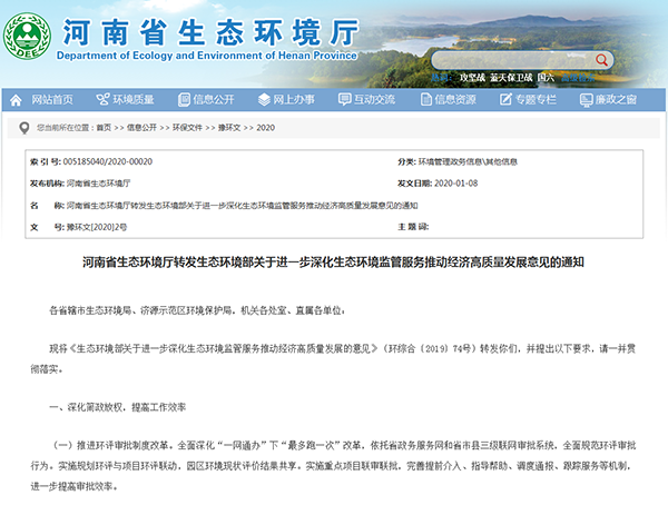 2020年1月8日,河南省生態(tài)環(huán)境廳轉(zhuǎn)發(fā)了生態(tài)環(huán)境部關(guān)于進(jìn)一步深化生態(tài)環(huán)境監(jiān)管服務(wù)推動(dòng)經(jīng)濟(jì)高質(zhì)量發(fā)展意見的通知,詳情如下: