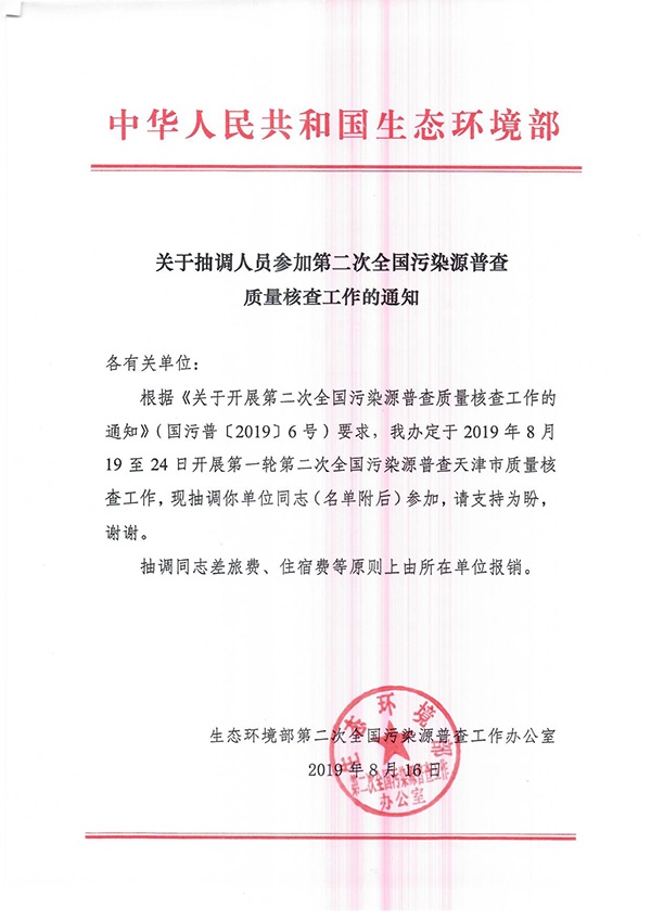 根據(jù)《關(guān)于開展第二次全國污染源普查質(zhì)量核查工作的通知》(國污普〔2019〕6號)和《關(guān)于抽調(diào)人員參加第二次全國污染源普查質(zhì)量核查工作的通知》的要求,我公司項目組成員張潔于2019年8月19日至24日參加生態(tài)環(huán)境部普查辦第一輪第二次全國污染源普查天津市質(zhì)量核查工作。在此次質(zhì)量核查工作過程中,張潔認真負責,技術(shù)能力突出,任勞任怨,表現(xiàn)良好,受到生態(tài)環(huán)境部普查辦表揚。