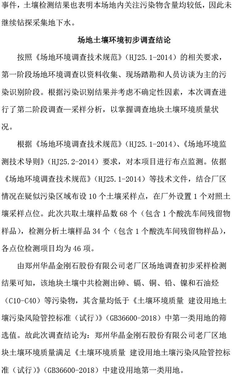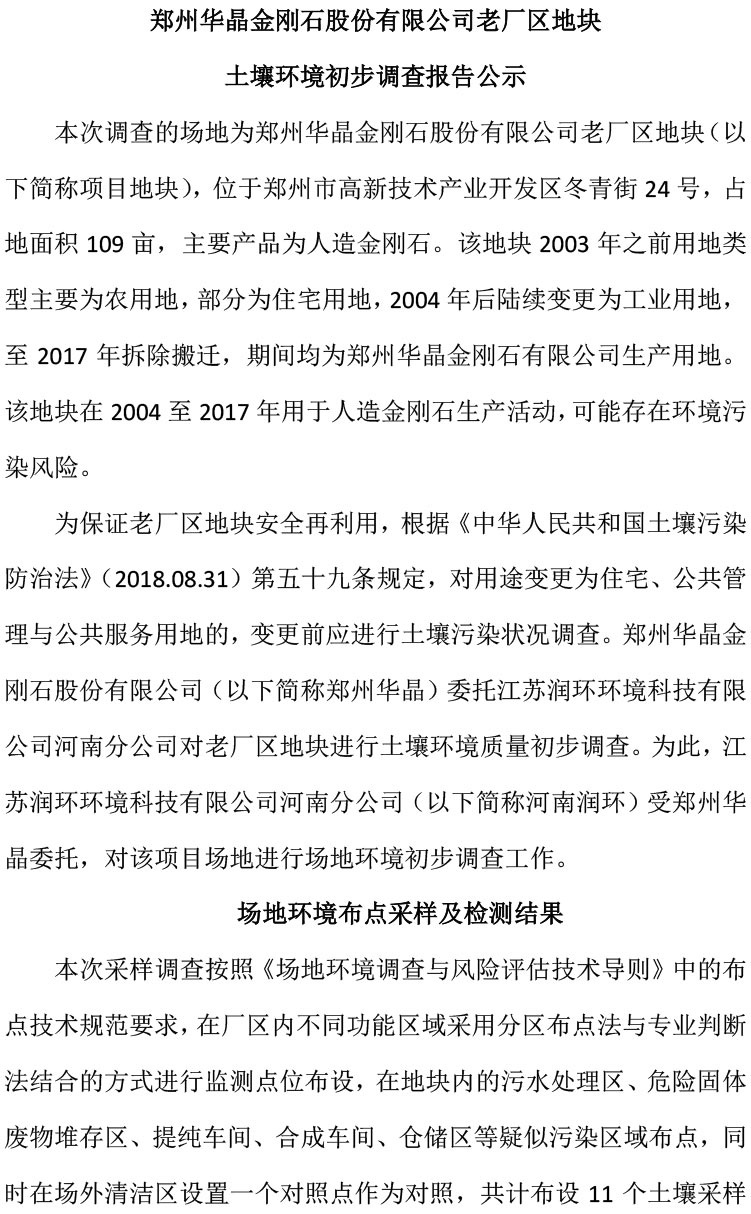 《鄭州華晶金剛石股份有限公司老廠區地塊土壤初步調查報告》公示