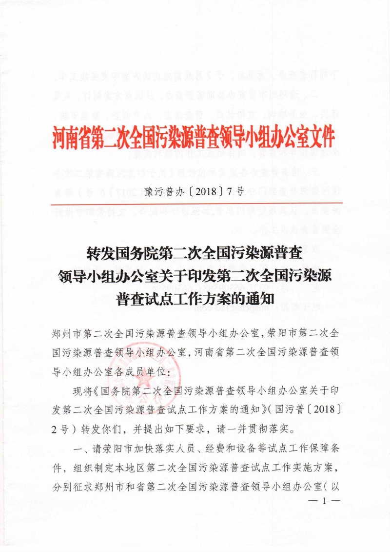 豫污普辦【2018】7號(hào)河南省第二次全國污染源普查領(lǐng)導(dǎo)小組辦公室轉(zhuǎn)發(fā)國務(wù)院第二次全國污染源普查領(lǐng)導(dǎo)小組辦公室關(guān)于印發(fā)第二次全國污染源普查試點(diǎn)工作方案的通知