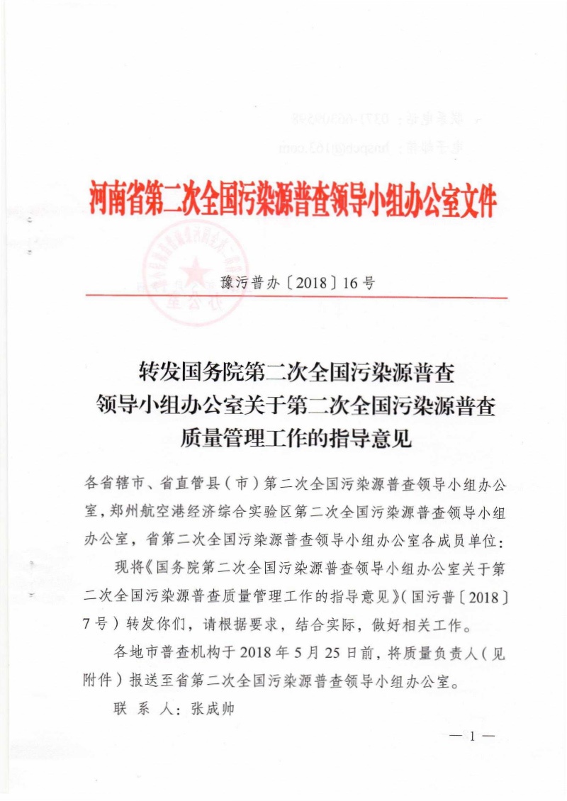 豫污普辦【2018】16號轉發關于第二次全國污染源普查質量管理工作的指導意見
