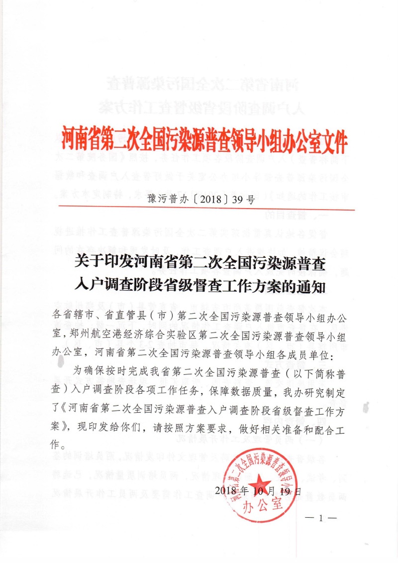 豫污普辦【2018】39號關于印發河南省第二次全國污染源普查入戶調查階段省級督查工作方案的通知